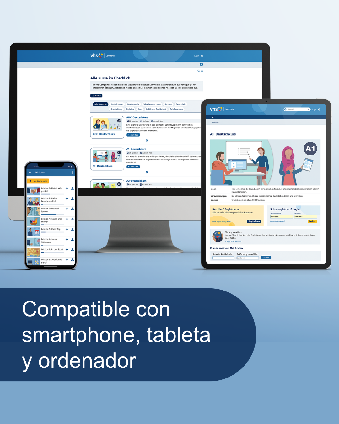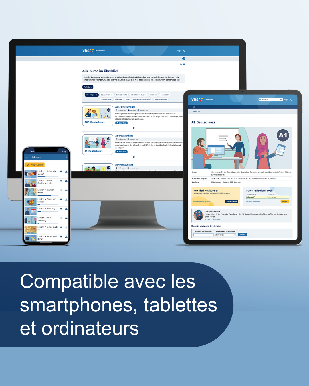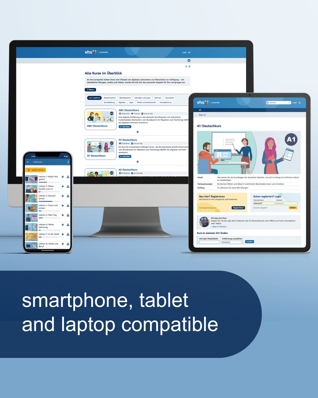 Hier können finden Sie ausführliche Infoblätter zu den einzelnen Kursen sowie eine Broschüre zum Deutschlernen mit dem vhs-Lernportal. Die Inhalte richten sich an Lehrkräfte und Mitarbeitende in Bildungsinstitutionen. Sie können die PDFs per E-Mail weitergeben oder drucken (lassen).